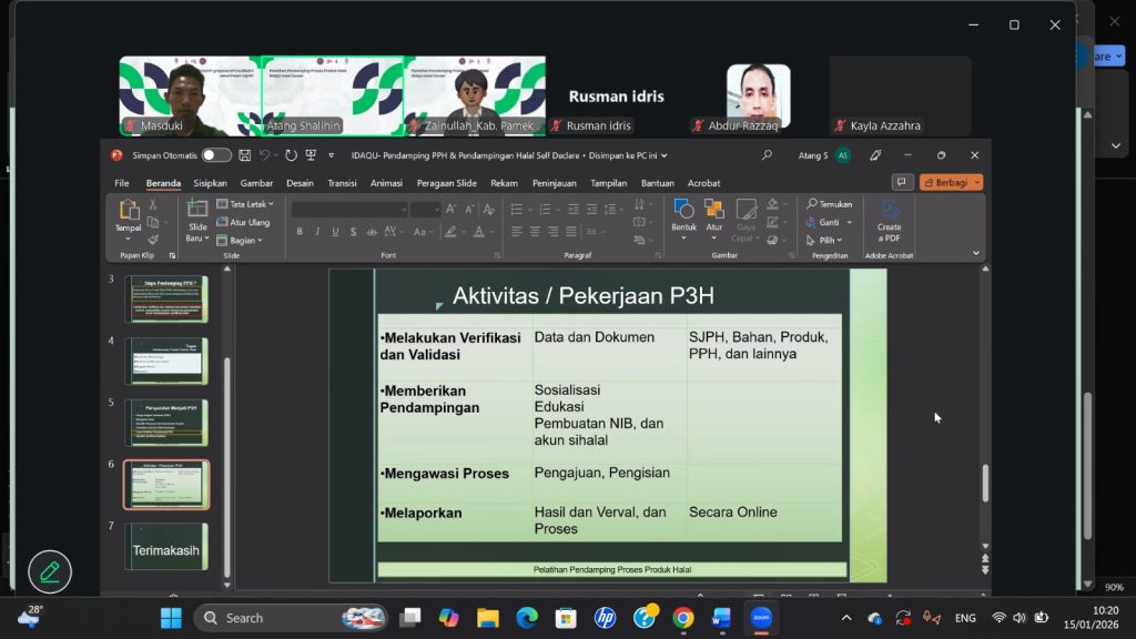 IDAQU Halal Center sukses menggelar pelatihan pendamping proses produk halal (PPH) pertama yang dilaksanakan tiga hari, pada 13-15 Januari 2026. kegiatan ini menjadi langkah IDAQU Halal Center dalam memperkuat ekosistem pendamping halal, khususnya dalam membantu dan mendukung percepatan sertifikasi halal bagi pelaku usaha Mikro, Kecil, dan Menengah(UMKM). Recrutment ini sekaligus menunjukan IDAQU Halal Center untuk membangun sumber daya manusia yang kompeten di bidang pendampingan proses produk halal.